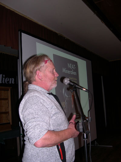 Peter Amacher aus Amsteg in der Schweiz machte im übervollen Saal des Gasthofes Senningerbräu den Anfang und referierte über seine Arbeit als Mineralienaufseher im Neat-Tunnel, dem größten derzeitigen schweizerischen Bauprojekt unter dem St. Gotthard. Man bekam nicht nur ein genaues Bild über die Mineralien, sondern auch über die Arbeitsweise von gigantischen Vortriebsmaschinen, von Schwierigkeiten, die entstehen und gemeistert werden müssen und den harten Arbeitsbedingungen, denen die Mineure ausgesetzt sind. Der Wissenschaftler und Strahler Peter Amacher reiht sich mit seiner bildhaften Sprache und abwechslungsreichen und gestochen scharfen Bildern (Mineralienbilder von Thomas Schüpbach) bei den großen Strahlerlegenden ein, die bereits in den Jahren zuvor in Bramberg das Publikum begeistert hatten.