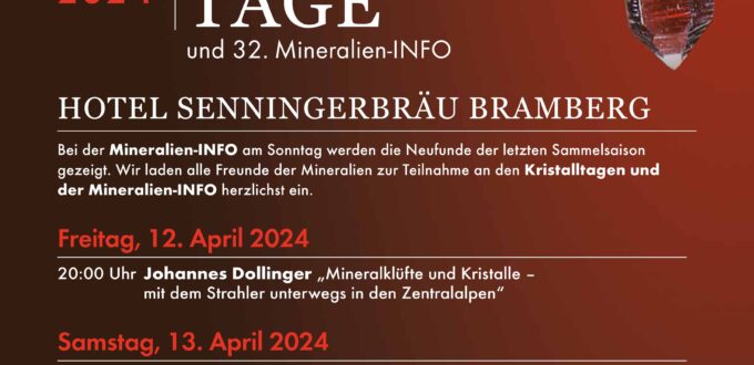 Kristalltage und Mineralien-Info 2014 in Bramberg Am 28. und 29. März 2014 fanden in Bramberg (Österreich) zum 11. Mal die Kristalltage statt. Der angekündigte Vortrag hatte bereits am Freitag viele Besucher angelockt. Der bekannte Stoasucha Erwin Burgsteiner sprach über “die mineralogischen Highlights des Pinzgaus der letzten 25 Jahre”. Die Zuhörer sahen eindrückliche Bilder von vielen […]