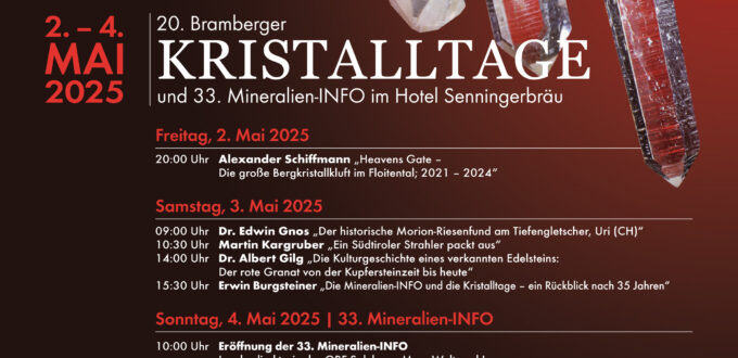 Programm für die Kristalltage und Mineralien-INFO 2022 Kristalltage 2022 Freitag, 29. April 2022: Millgramer F., Vorreiter H., Kaltenhauser F., Huber W. Die große Rauchquarzkluft im Habachtal 2021 Samstag, 30. April 2022: 09:00 Uhr: Herbert Grabmayer, Hans-Peter Daum „3 Jahre – 2 Freunde – 1 Kluft“, Die Hocharnkluft von 2014 – 2016 10:30 Uhr: Dr. Bernd […]