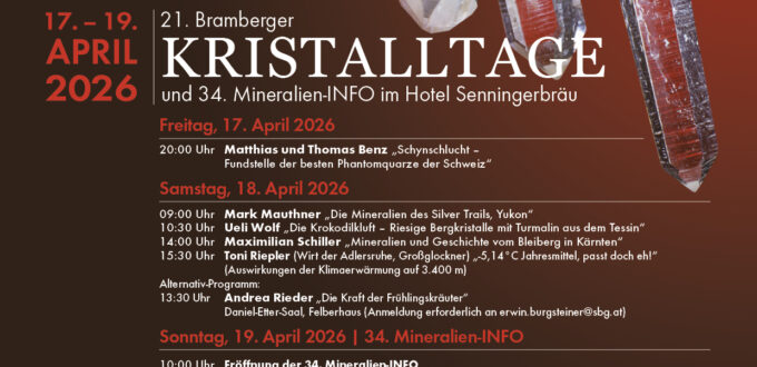 Kristalltage und Mineralien-Info 2010 in Bramberg Am 19. und 20. März 2010 fanden in Bramberg (Österreich) zum 7. Mal die Kristalltage statt. Dieses Jahr war der Anlass besonders gut besucht – die ausgezeichneten Referate und die bekannte Gemütlichkeit hatten viele Besucher hauptsächlich aus Österreich, aber auch aus grosser Distanz (Deutschland, Italien, Portugal, Polen, Schweiz) angezogen. […]