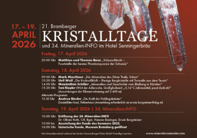 Dieser makellose Einzelkristall maß 23 cm in der Länge und wies trotz der großen Beanspruchung in der Kluft keine Beschädigung auf. In der Folge konnten viele lose Spitzen und Kristallgruppen ans Tageslicht gehoben werden. Interessant dabei sind Einschlüsse von Ilmenit in den hellen Rauchquarzen. Im hintersten Teil der Kluft lagen Calcite, die neben dunklen Einschlüssen auch Anflüge von Hämatit aufweisen, die einen rötlichen Schimmer hervorrufen. Perikline bildeten kleine Rasen.